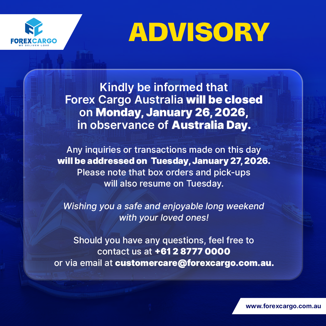 Kindly be informed that Forex Cargo Australia will be closed on Monday, January 26, 2026, in observance of Australia Day. Any inquiries or transactions made on this day will be addressed on Tuesday, January 26, 2026. Please note that box orders and pick-ups will also resume on Tuesday. For enquiries and assistance, you may reach […]